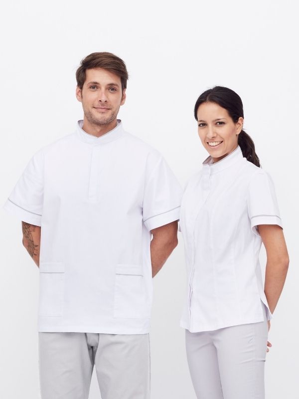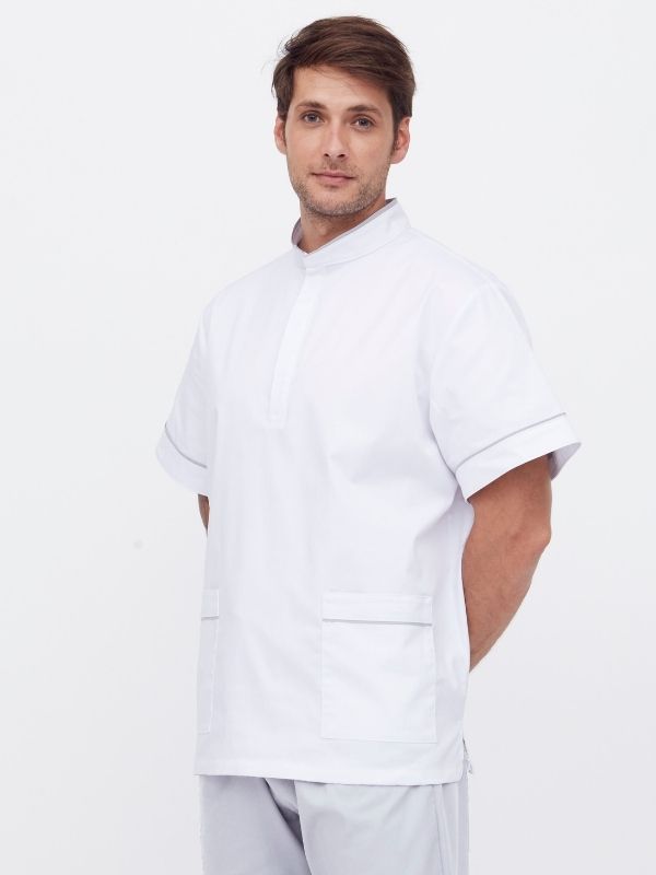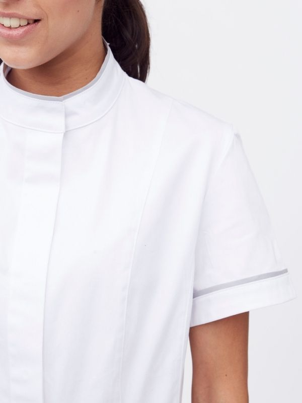 Bata para mujer cuello mao, manga corta y vivos en contraste, su botonadura oculta con tapeta y cierre de automáticos ofrece un frontal limpio y funcional.