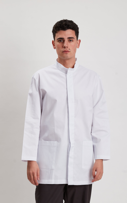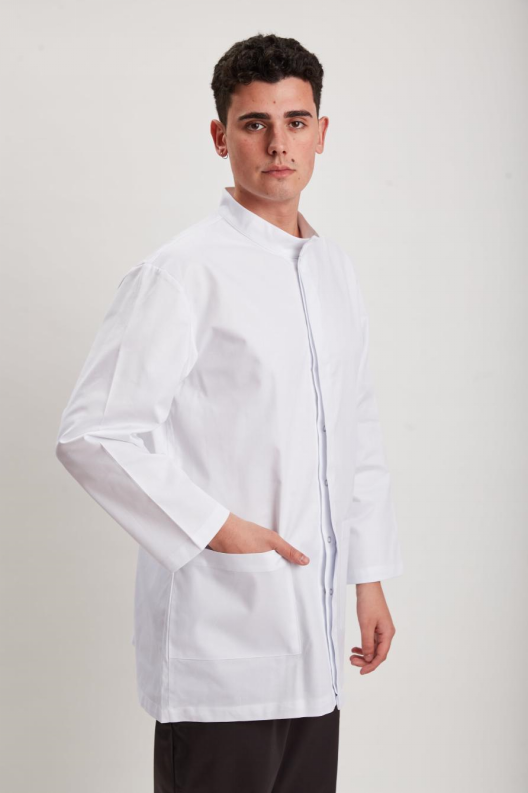 Bata para hombre manga larga con cuello mao y dos bolsillos. Su botonadura oculta con tapeta y cierre de automáticos ofrece un frontal limpio y funcional.