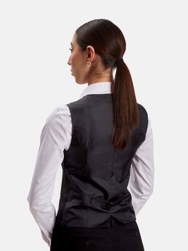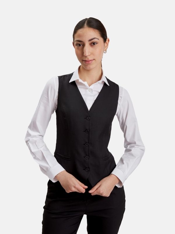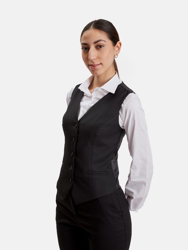 Chaleco básico forrado confeccionado en tejido de 64% poliéster, 34% viscosa y 2% lycra. Presenta un diseño con delantero acabado en pico, que incluye pinzas para mejorar el ajuste y la silueta; en la versión femenina, además, cuenta con pinzas de pecho para mayor entalle. El cierre frontal es de botones. La espalda está confeccionada en tejido de forro e incluye un corte central con pinzas que optimizan el calce. El bajo trasero presenta un diseño en forma de pico, aportando un detalle distintivo al patrón. Completa el diseño con bolsillos de ojal en el frente.