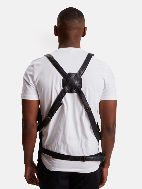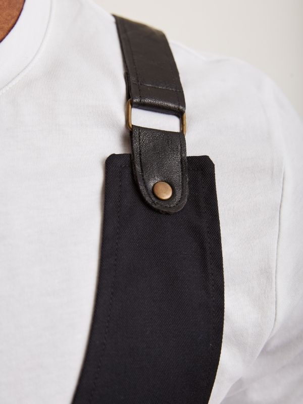 La parte trasera presenta un sistema de tirantes cruzados en polipiel, unidos mediante una pieza octogonal central reforzada. Estos tirantes rodean los hombros y el torso, y se ajustan lateralmente mediante hebillas metálicas, proporcionando sujeción y un ajuste regulable. Prenda diseñada para ofrecer estilo y comodidad en entornos de coctelería o servicio profesional.