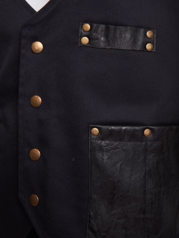 Chaleco coctelero confeccionado en tejido principal de 65% poliéster y 35% algodón, con detalles en polipiel que aportan contraste. Diseño sin cuello y escote profundo en pico, con cierre frontal mediante automáticos metálicos en oro viejo. Incorpora dos bolsillos de plastrón inferiores y un aplique superior, todos en polipiel y rematados con remaches decorativos en oro viejo. Bajo con corte en pico.