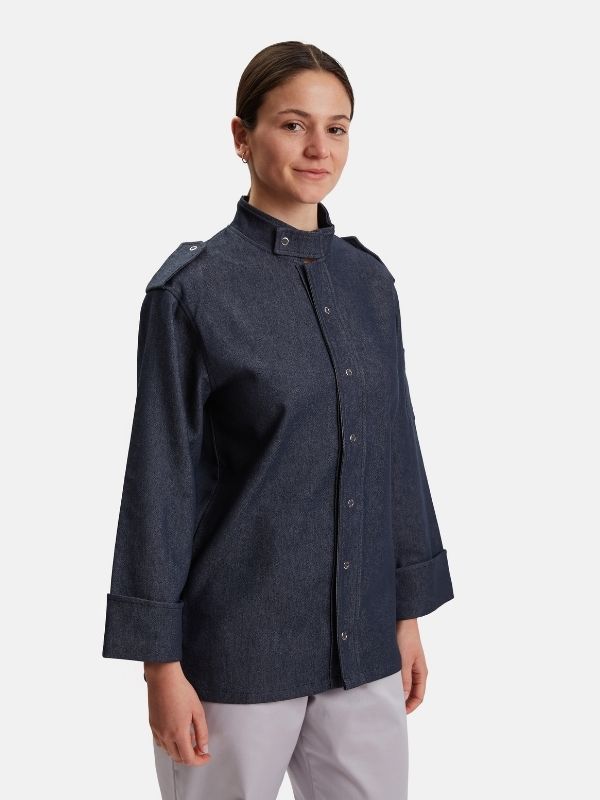 Chaqueta cargo de cocina disponible en dos tejidos: denim técnico (60% poliéster, 37% algodón, 3% elastán) y tejido liso (97% algodón, 3% elastán), ambos diseñados para ofrecer resistencia, comodidad y libertad de movimiento.