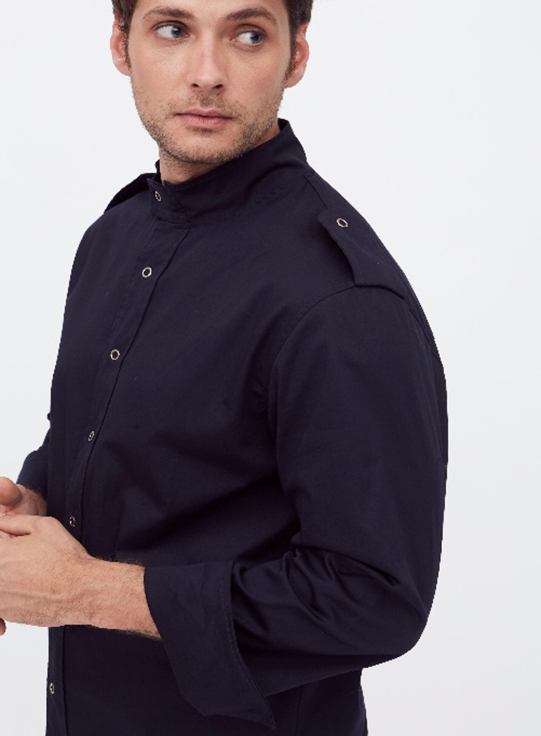 Diseño con cuello mao que se une mediante una solapa con automático visible, aportando un cierre seguro con un detalle distintivo. El delantero se cierra con automáticos metálicos visibles. Presenta galones en los hombros, fijados con automáticos metálicos, que permiten su apertura.