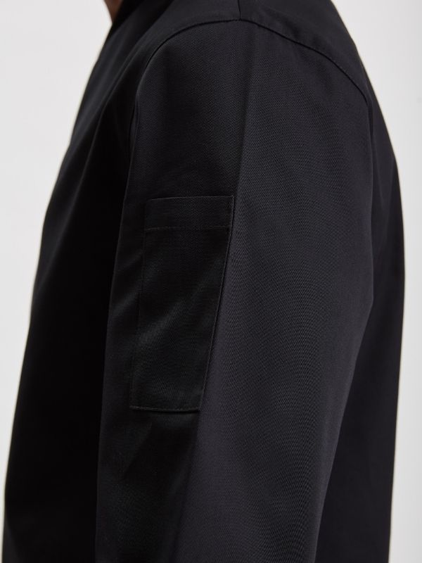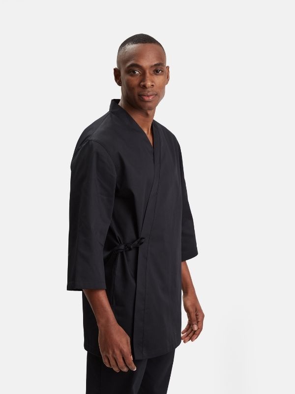 Chaqueta de cocina con diseño tipo kimono, confeccionada con patrón cruzado que permite superponer un delantero sobre el otro, cerrándose lateralmente mediante una lazada exterior. Presenta un escote en pico limpio, que refuerza su estética depurada y de inspiración oriental. Cuenta con media manga, que facilita la movilidad y aporta ligereza, y un pequeño bolsillo funcional en una de las mangas.