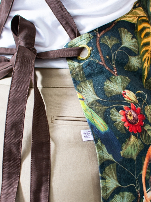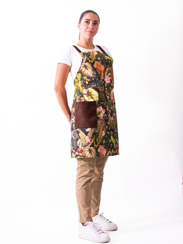 Peto Jungla, confeccionado en 100 % algodón, que ofrece comodidad, transpirabilidad y suavidad para el uso diario. Su original estampado de inspiración natural, con detalles en marrón, aporta un toque fresco y distintivo sin perder profesionalidad.