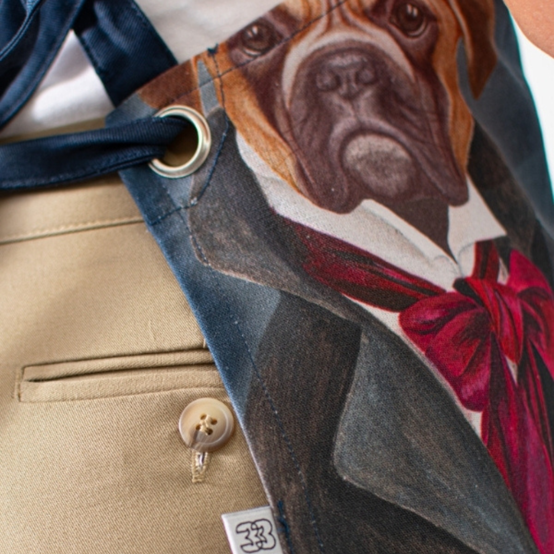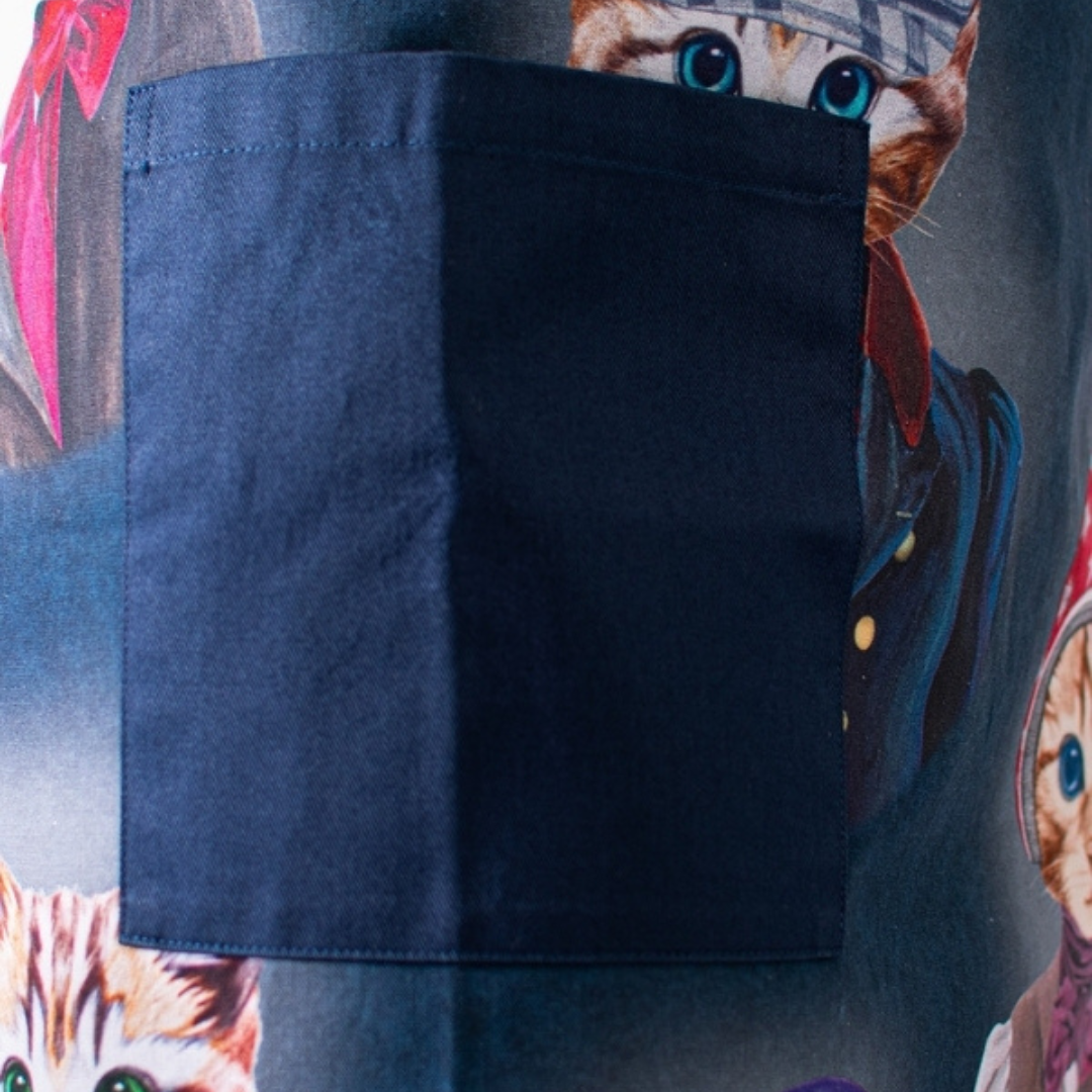 Peto Perros y Gatos, confeccionado en 100 % algodón, un tejido natural que ofrece suavidad, transpirabilidad y confort durante toda la jornada. Su estampado con detalles en azul añade un toque divertido y distintivo, ideal para entornos profesionales que buscan un estilo más cercano y original.